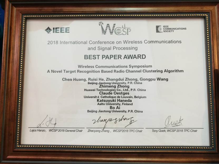 2018年10月17至19日,第十届无线通信与信号处理国际学术会议在杭州召开,澳门六合彩资料论坛 2016级博士生生黄晨在何睿斯副教授和钟章队教授指导下撰写并发表的论文“A Novel Target Recognition Based Radio Channel Clustering Algorithm”获这次会议最佳论文奖。本次会议共收到700余篇投稿,最后共录用287篇文章。