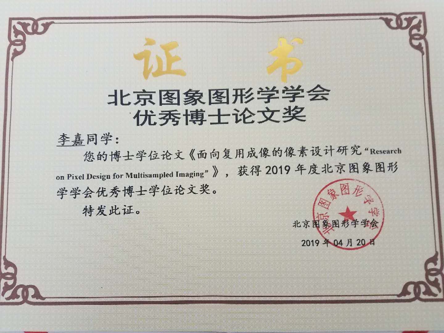 我校李嘉博士荣获北京图象图形学学会 2019优秀博士学位论文奖