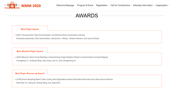 国际多媒体建模大会(MMM)是中国计算机学会推荐的多媒体领域的重要国际会议,曾在亚洲、欧洲、北美洲等地举办过25届。本次会议一共收到246篇投稿,其中35篇Oral,占比14%,最终产生一篇最佳论文和一篇最佳学生论文。