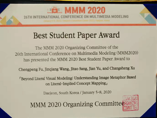 2020年1月5日至1月8日,在韩国大田召开了第26届国际多媒体建模大会(26th International Conference on Multimedia Modeling, MMM2020)。澳门六合彩资料论坛 机器学习与认知计算团队完成的论文Beyond Literal Visual Modeling: Understanding Image Metaphor Based on Literal-Implied Concept Mapping通过专委会评审推荐、现场答辩、专委会评议,获得了本次会议唯一最佳学生论文奖(Best Student Paper Award)。