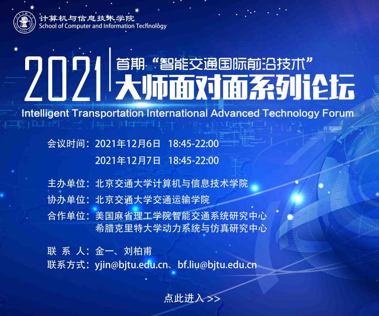 澳门六合彩资料论坛» 澳门六合彩资料论坛 动态» 预告:澳门六合彩资料论坛 首期“智能交通国际前沿技术”大师面对面系列论坛将于2021年12月6日-12月7日举办 预告:澳门六合彩资料论坛 首期“智能交通国际前沿技术”大师面对面系列论坛将于2021年12月6日-12月7日举办 发布时间:2021-11-29 阅读次数: 由北京交通大学、美国麻省理工澳门六合彩资料论坛 以及希腊克里特大学联合举办的首期“智能交通国际前沿技术”大师面对面系列论坛将于2021年12月6日-12月7日在线上举行。届时,论坛将邀请来自欧洲和美国的三位著名学者,就城市智能交通、网联智能化无人车、交通控制理论与方法、车路协同与自动驾驶等研究领域进行深入探讨。论坛旨在交流智能交通系统等国际前沿技术,诚邀对未来智能交通领域研究感兴趣的老师同学参加本次论坛!