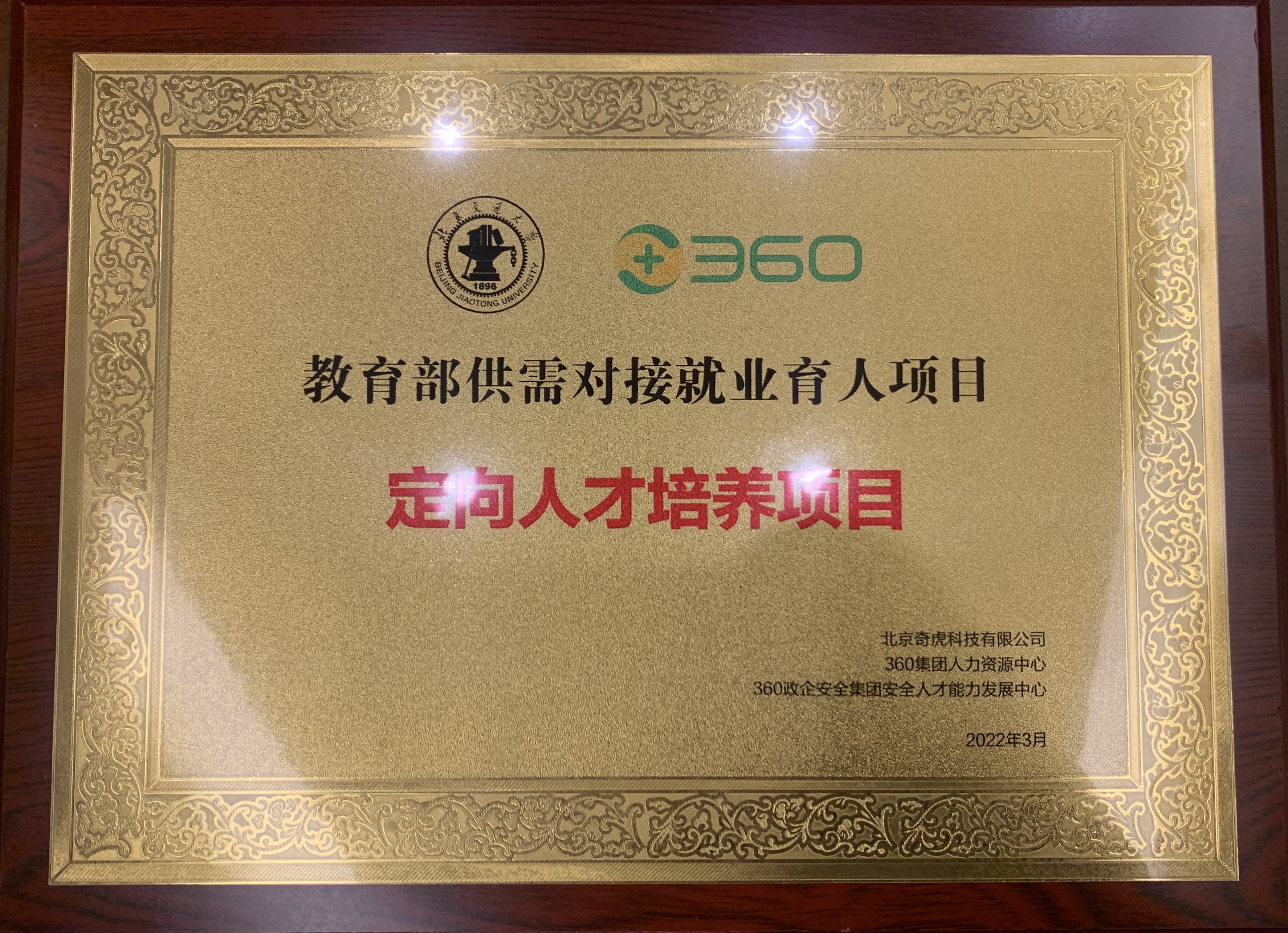 教育部高校学生司2021年首次实施供需对接就业育人项目,澳门六合彩资料论坛 与360公司合作设立定向人才培养项目—北京交通大学信息安全专业人才培养和实践能力提升项目,面向大三大四学生进行专业实训课程培养,合办网络安全攻防特色定向人才培养班。
