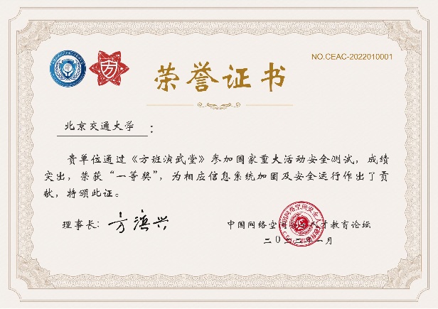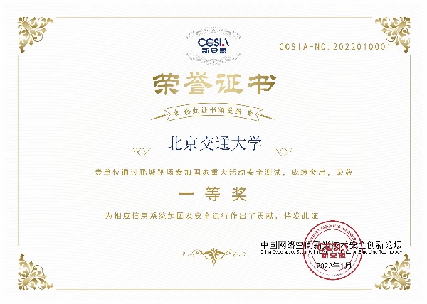 2022年1月在鹏城实验室、中国网络空间安全人才教育论坛(“网教盟”)、中国网络空间新兴技术安全创新论坛(“新安盟”)联合面向北京冬奥会、冬残奥会的安全演练活动中,北京交通大学网络空间安全学科责任教授刘吉强老师领队、童恩栋和牛温佳老师指导的研究生团队(武兴宇、吴亚伦、田蕴哲、黄欣宇、陈彤、相迎宵、李轶珂、贾博为、孙瑞、乔紫嫣、陈诗瑶等)积极参与,共挖掘出高危漏洞1个、中危漏洞2个以及低危漏洞14个,最终以第一名成绩荣获一等奖,为保障北京冬奥会、冬残奥会的网络安全贡献了交大力量。