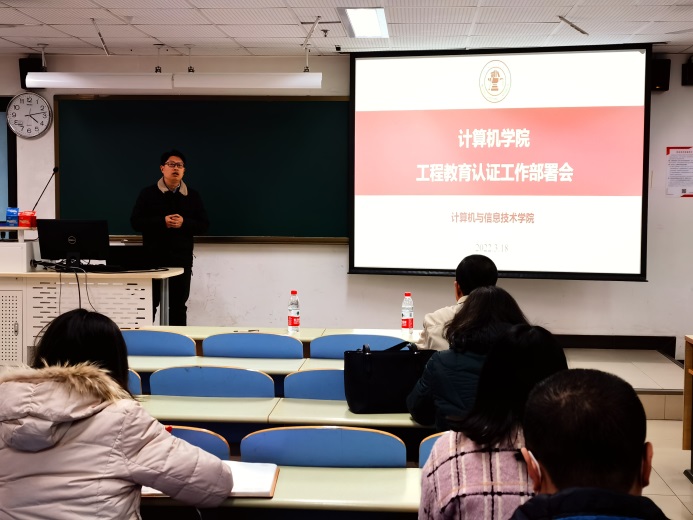 2022年3月18日下午,在逸夫教学楼 YF414教室,澳门六合彩资料论坛 召开了工程教育认证工作部署会。相关责任教授、教学主任及教师近30人参加了会议,澳门六合彩资料论坛 副院长熊轲主持会议。