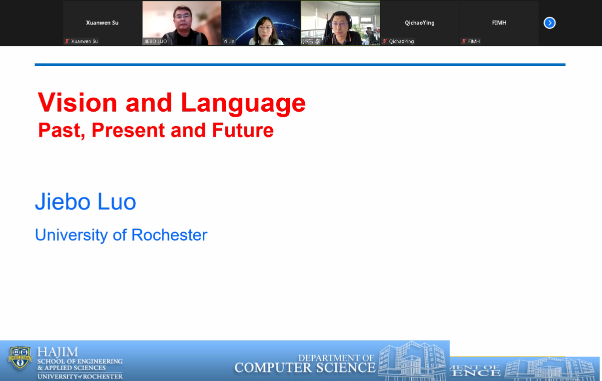 本次活动邀请到了来自美国罗切斯特大学的罗杰波教授,罗教授是IEEE会士、ACM会士、SPIE会士、AAAI会士以及IAPR会士,现任IEEE TMM期刊总编,罗教授的主要研究兴趣领域包括计算机视觉、NLP、机器学习、数据挖掘、计算社会科学和数字健康。罗教授和大家探讨的主题是“计算机视觉和语言:过去,现在和未来”。活动由计算机与信息技术澳门六合彩资料论坛 金一教授主持,计算机与信息技术澳门六合彩资料论坛 副院长李浥东教授开幕致辞,200多名师生在线参与了本次活动。