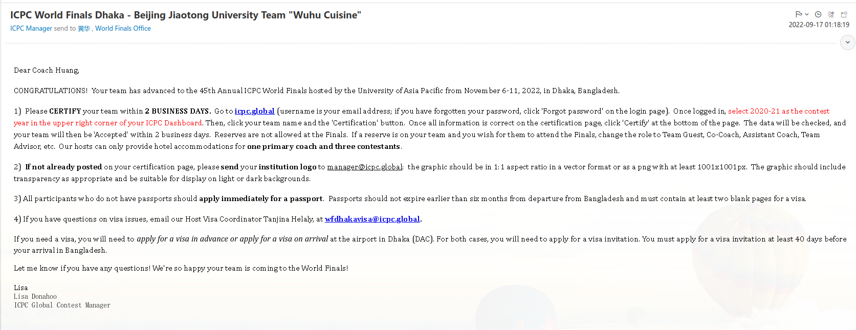 图2 ICPC总部通知我校晋级全球总决赛的邮件