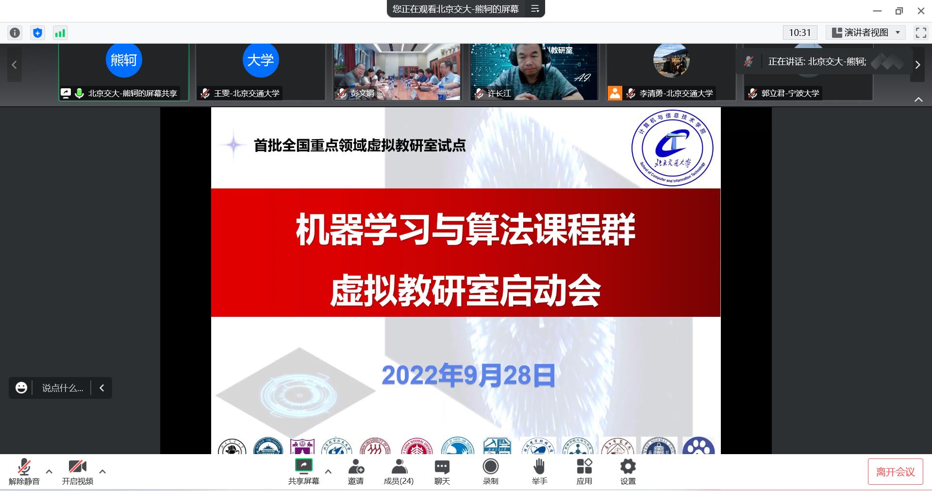 机器学习与算法课程群虚拟教研室于2022年9月28日下午通过线上线下结合的方式召开建设启动会。会议由北京交通大学计算机与信息技术澳门六合彩资料论坛 副院长熊轲教授主持,重点领域教学资源建设项目管理办公室副主任许长江、北京交通大学本科生院副院长宋瑞、北京交通大学计算机与信息技术澳门六合彩资料论坛 院长蔡伯根参加会议并致辞,北京交通大学、武汉大学、南京大学、北京航空航天大学、北京邮电大学、西南交通大学、中国矿业大学、华中师范大学、桂林电子科技大学、宁波大学、西北师范大学和武夷澳门六合彩资料论坛 等虚拟教研室成员单位的专家和教师代表出席了会议。