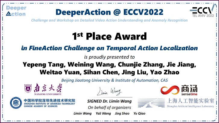 近日,北京交通大学赵耀教授带领的MePro团队与中科院自动化所刘静研究员带领的团队合作参加了ECCV 2022的DeeperAction挑战赛,获得了时序动作定位挑战赛冠军。挑战赛第一完成人唐业鹏是张淳杰教授指导的硕士研究生。团队成员包括:唐业鹏、王卫宁、张淳杰、江洁、原洧涛、陈思涵、刘静、赵耀。