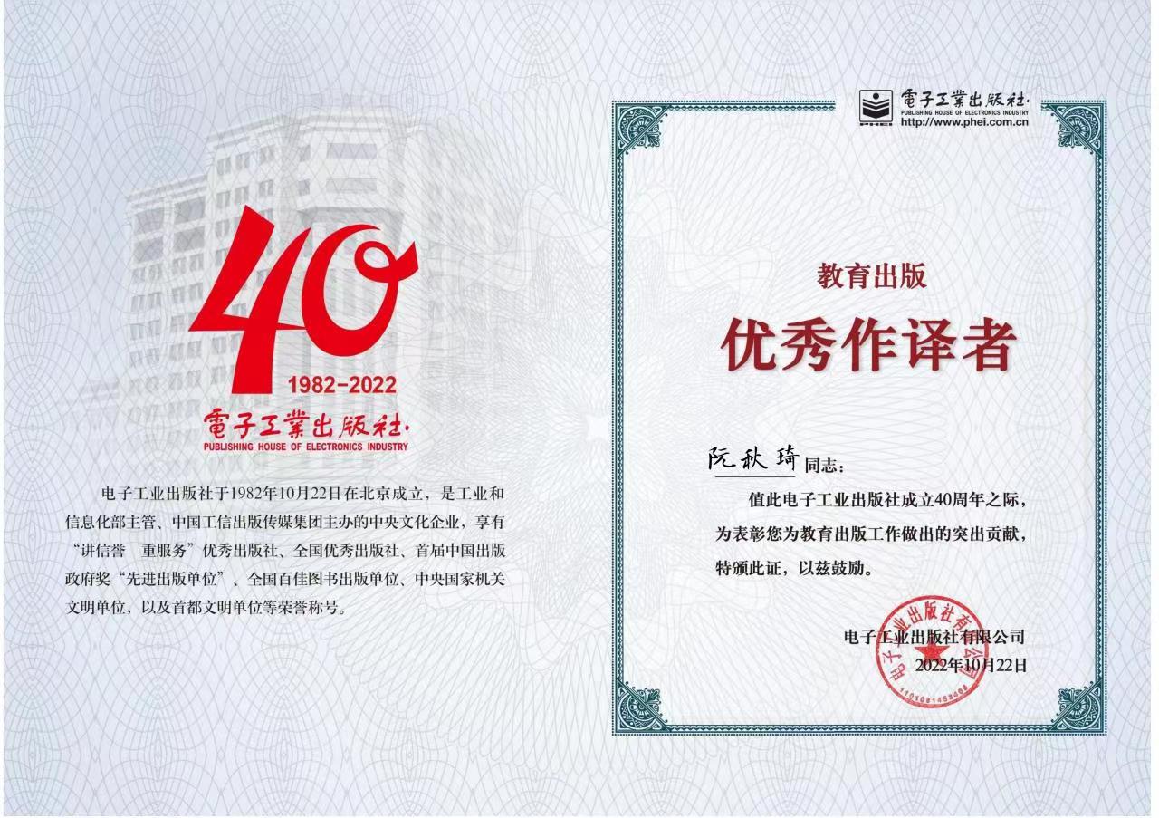2022年10月,在电子工业出版社成立40周年之际,澳门六合彩资料论坛 阮秋琦教授荣获电子工业出版社优秀作译者殊荣。