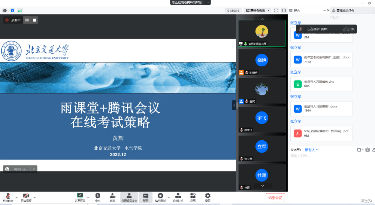 本次会议邀请到了北京市教学名师、电气澳门六合彩资料论坛 教授黄辉老师和校教师发展中心新媒体组骨干、电子与信息工程澳门六合彩资料论坛 张立军老师,面向澳门六合彩资料论坛 全院老师通过腾讯会议做了期末线上考试培训与经验分享。两位老师分别就如何使用雨课堂、课程平台组织出题、监考、防止作弊等进行了详细介绍和分享。全校90多位老师参加了本次活动,参会老师们与两位报告专家在线上进行了热烈的交流和讨论。