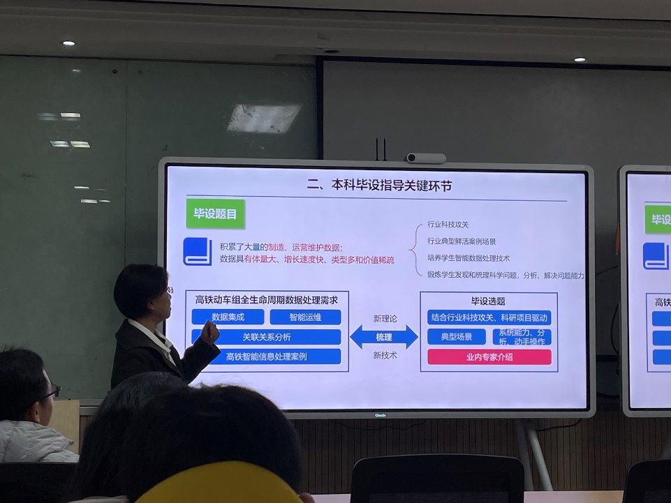 张春老师以高速铁路为例,介绍了自己在本科毕设关键环节的指导心得,特别结合铁路信息技术卓越工程师培养目标,并在毕设环节如何体现进行了经验分享。